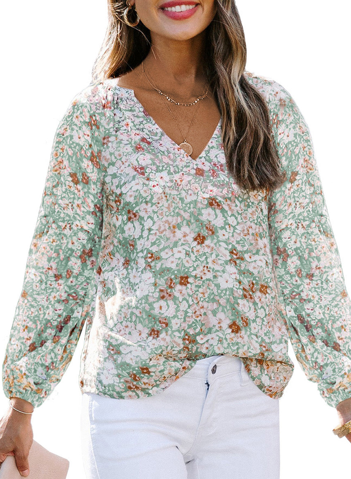 Women V-neck Slim Fit Chiffon Blouses Lantern Sleeve Floral Shirt