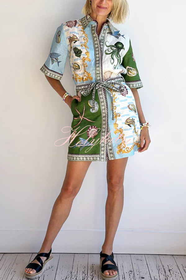 Deep Sea Dreaming Linen Blend Unique Print Tie-up Pocketed Shirt Mini Dress