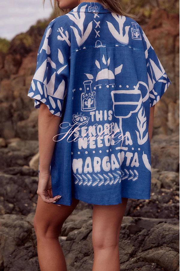 Vibrant Beach Satin Unique Print Colorblock Trim Button Down Oversized Blouse