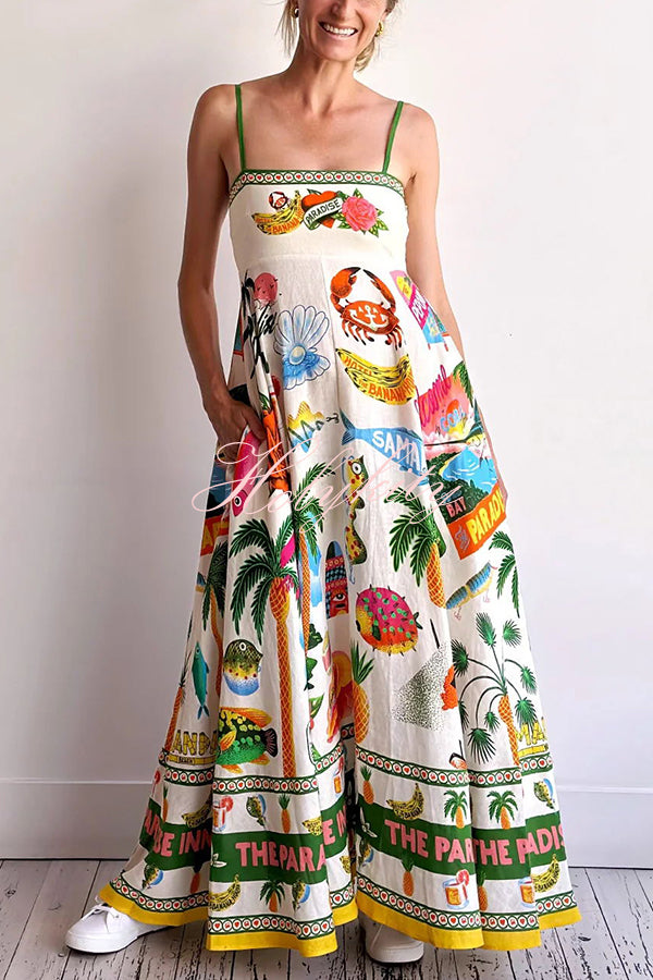 Holiday Paradise Linen Blend Unique Print Smocked Back Pocket Maxi Dress