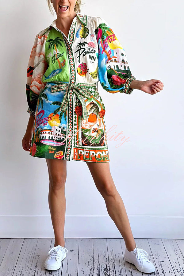 Sasha Linen Blend Unique Printed Shirt Style Tie-waist Mini Dress