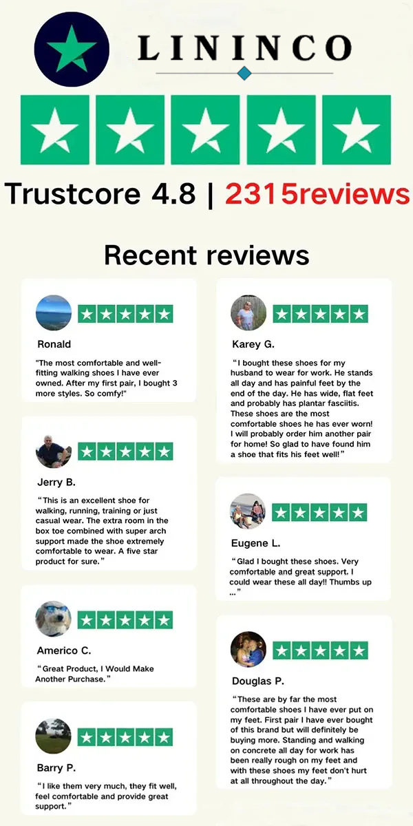 As an orthopedic specialist, I recommend the shoes from lininco for anyone experiencing pain in the back, knees, or feet. They provide the right support, improve posture, and evenly distribute pressure, which alleviates pain and prevents issues from worsening. They offer comfort and stability, allowing you to move without pain.