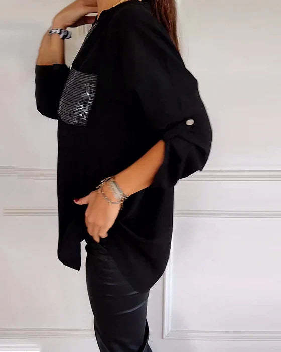 ✔ Elegant Sequin Detailing: The sequined trim and pocket add a sparkling touch that elevates this top from basic to bold.