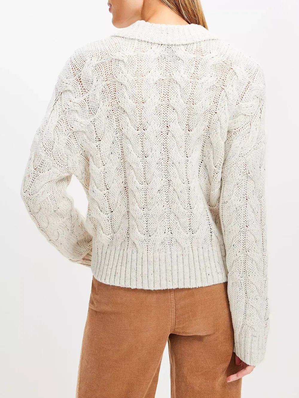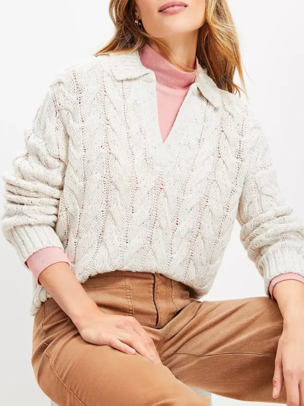 A collared neckline adds a little prep, panache, and je ne sais quoi to this polished yet easygoing soft cable knit. Collared split neck. Long sleeves.