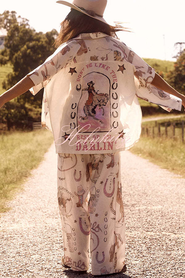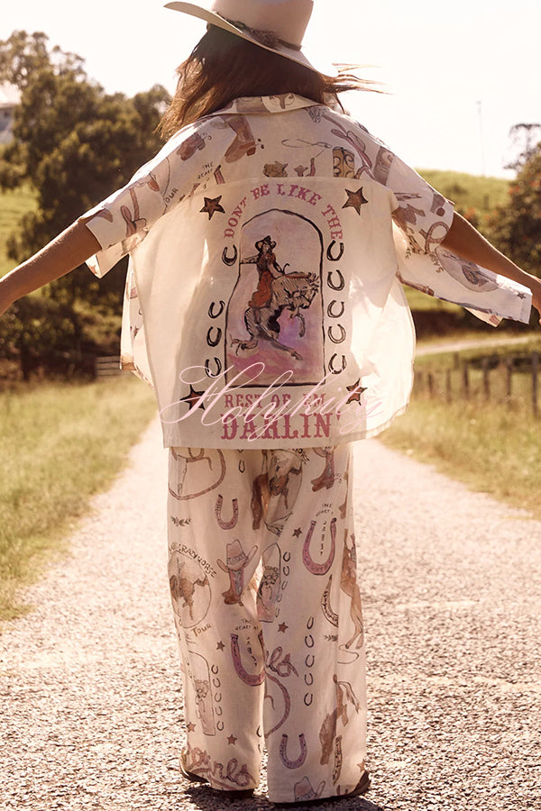 Linen Blend Unique Printed Short-sleeved Shirt and Elastic Waisted Baggy Pants Set