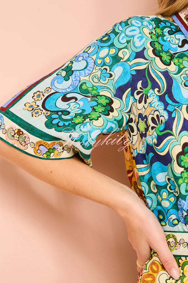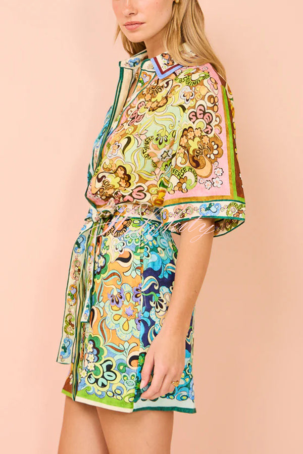 Sasha Linen Blend Unique Printed Shirt Style Tie-waist Mini Dress