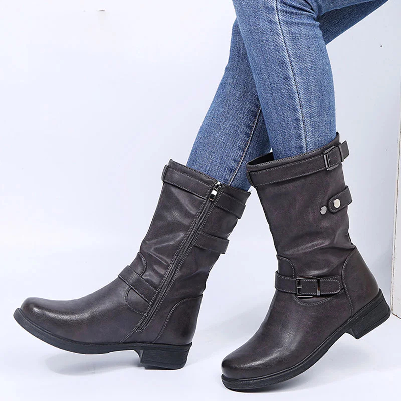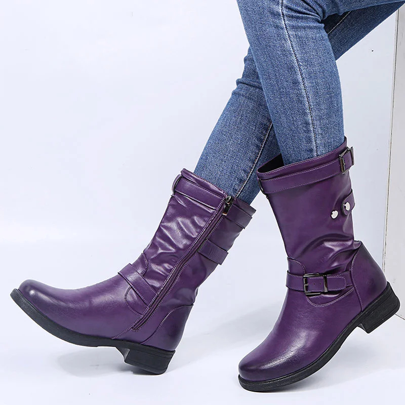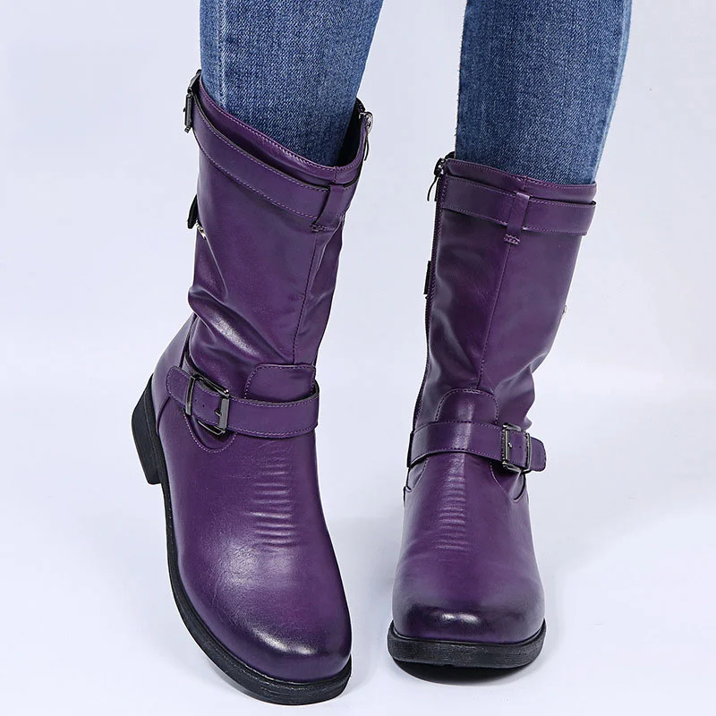 Low Heel Women's Boots with Polished Color Belt Buckle