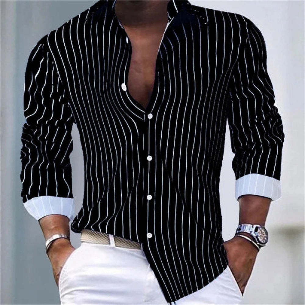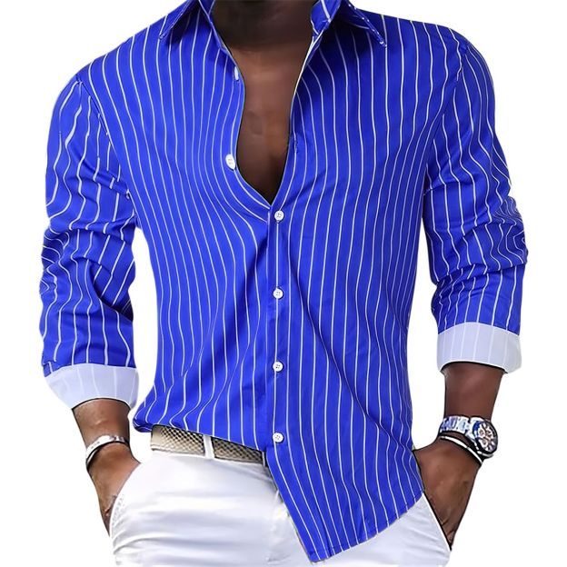 Featuring clean vertical stripes and sharp contrast cuffs, this long-sleeve button-down delivers a tailored silhouette that flatters without restricting movement. Ideal for both business-casual looks and elevated off-duty fits, it’s the perfect blend of crisp structure and everyday comfort.