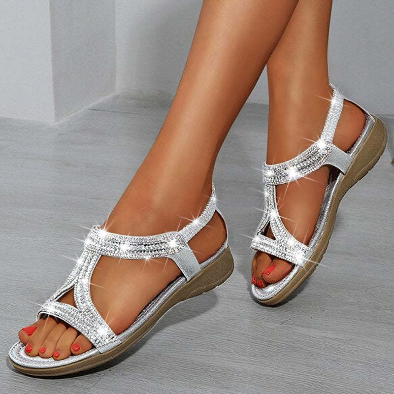 Flat sandals with a classic bohemian T strap style, unique open toe with rhinestones ornaments which makes the shoes more distinctive.