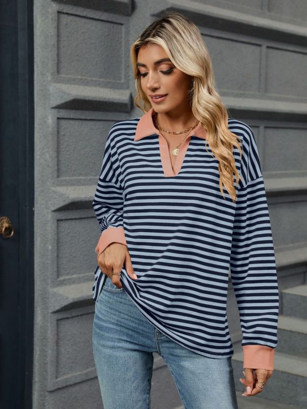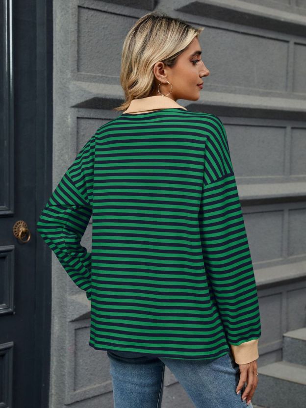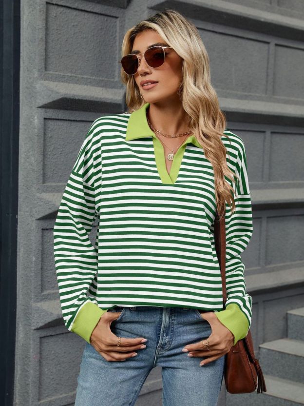 Striped Johnny Collar Long Sleeve Sweatshirt