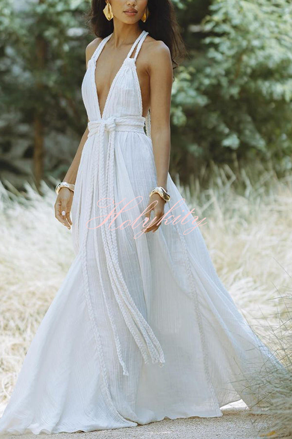Step into the whisper of summer with one of our maxi dresses. Crafted from the softest cotton gauze, this dress embodies the essence of a sun-kissed vacation with its plunging neckline and delicate braided tie waist. The flowing skirt dances in the breeze, providing comfort and unparalleled style. From the open, inviting style to the soft touch of the fabric, it's the embodiment of pure, effortless style.