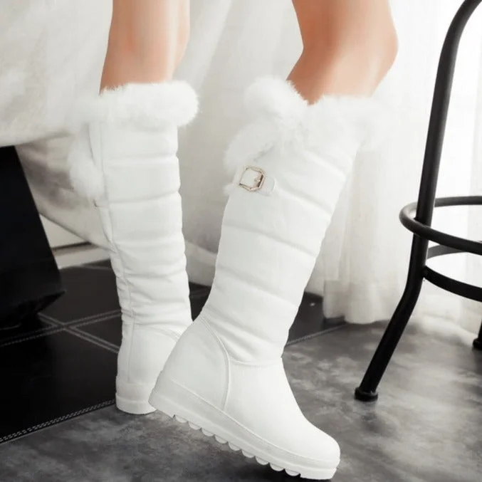 Toe Shape: Round toeHeel Height: Med, 5.5cmShaft Height: 15.4inch (39cm)Shaft Circumference: 14.2inch (36cm)Lining material: Faux furClosure Type: Slip-onColor: White, Red, BlackSeason: WinterOccasion: Casual/Daily