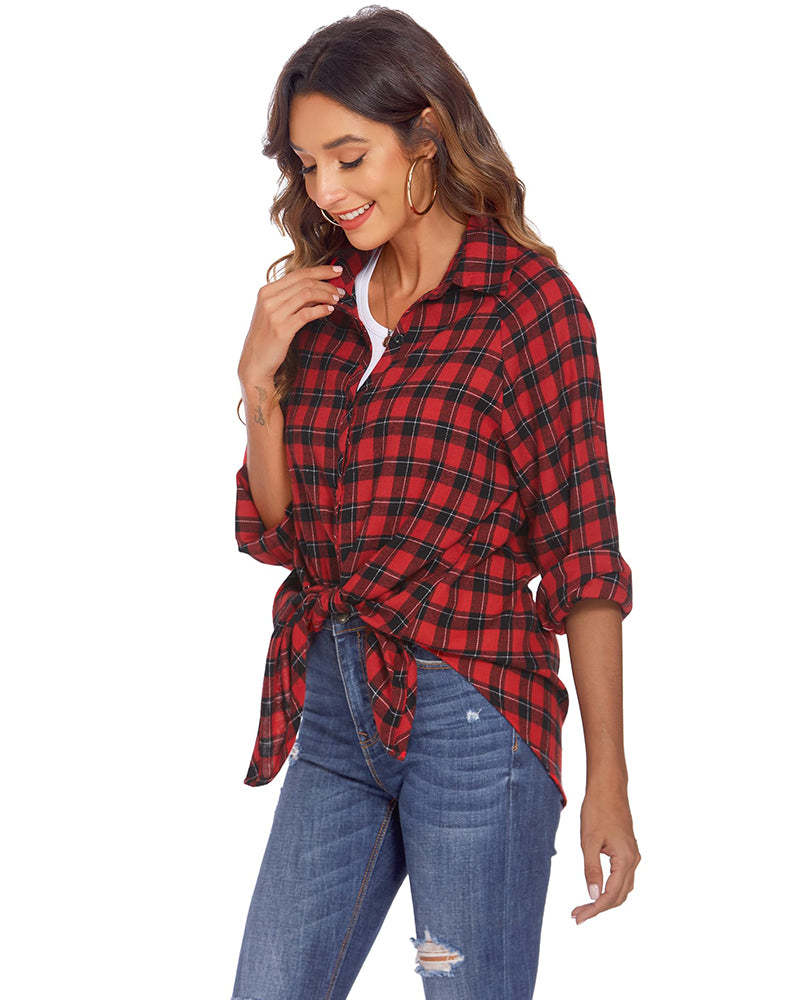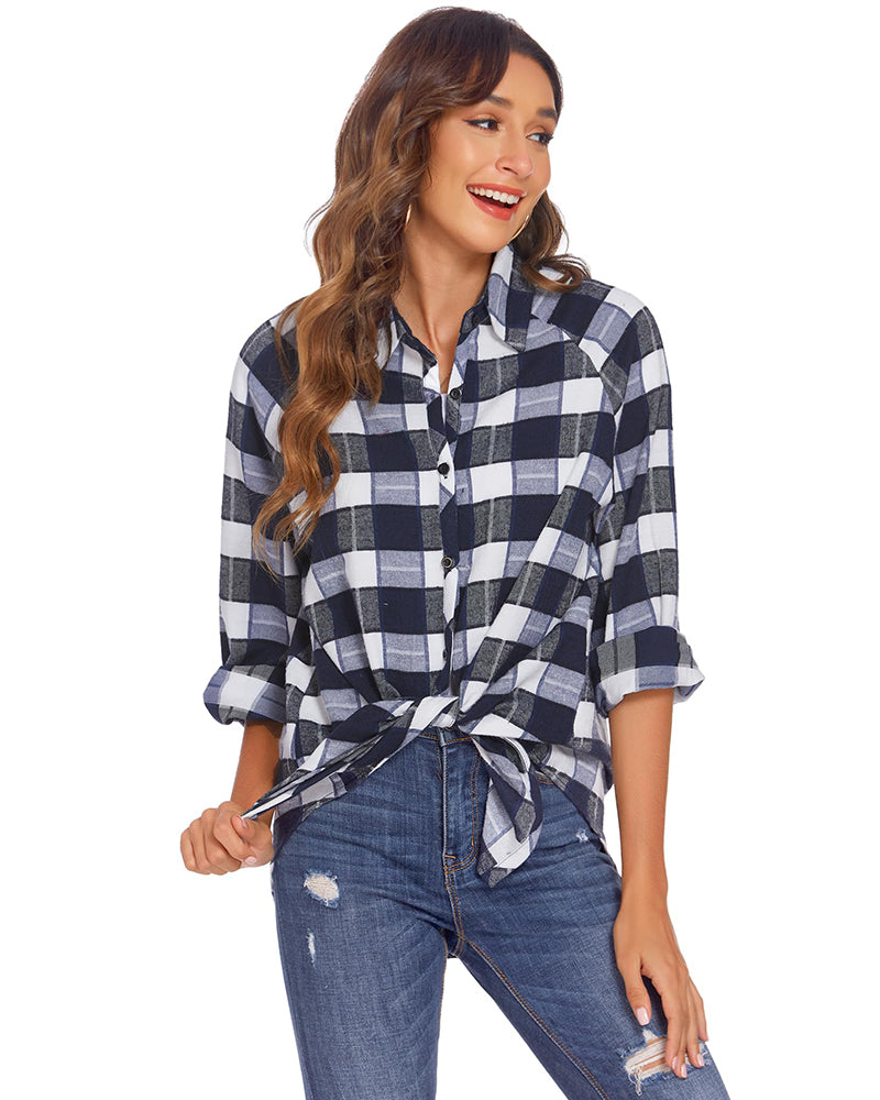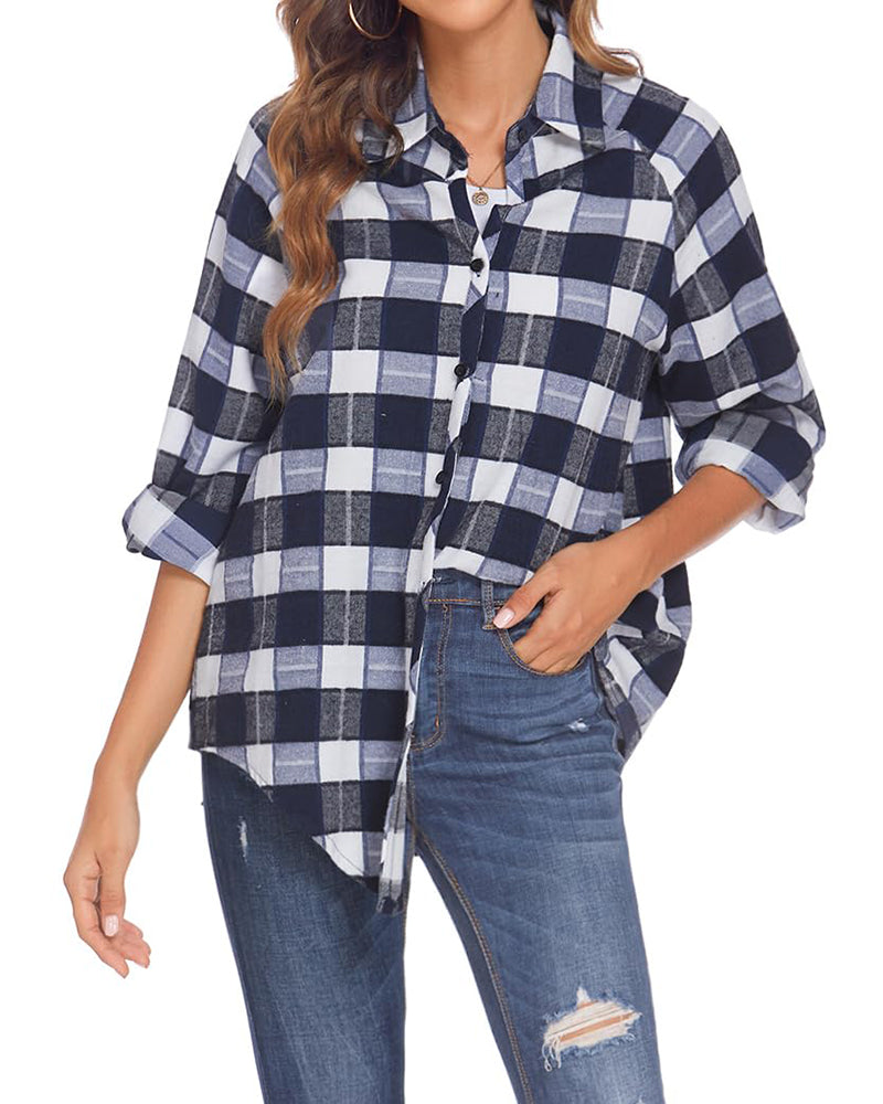 Womens Casual Cuffed Long Sleeve Plaid Button Down Shirts Blouse Tops