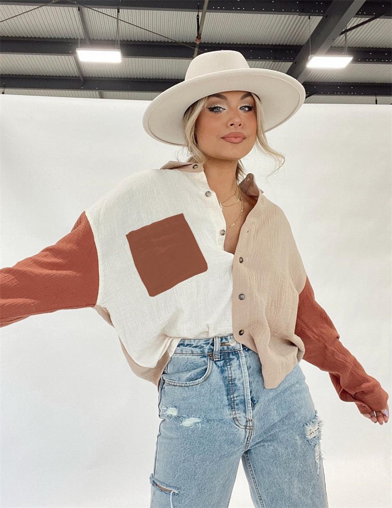 Color Block Button Down Shirts Long Sleeve Linen Shirt-Zeagoo