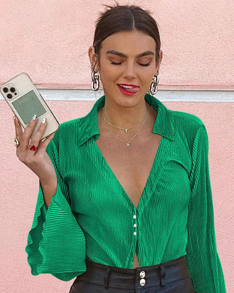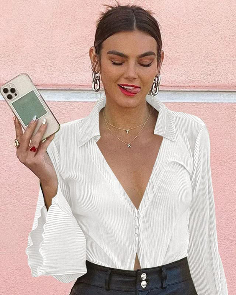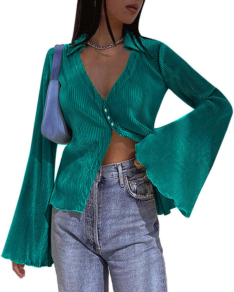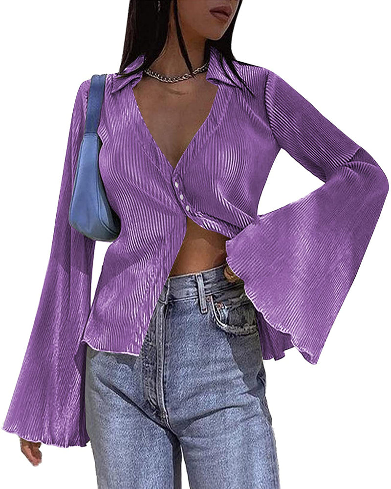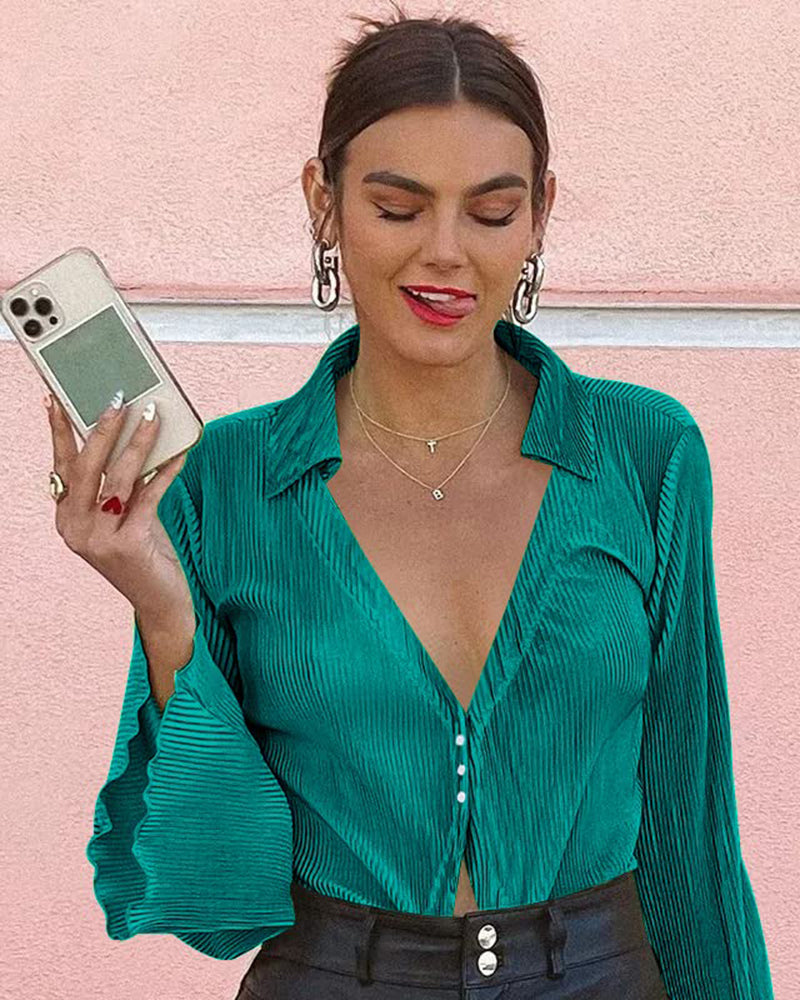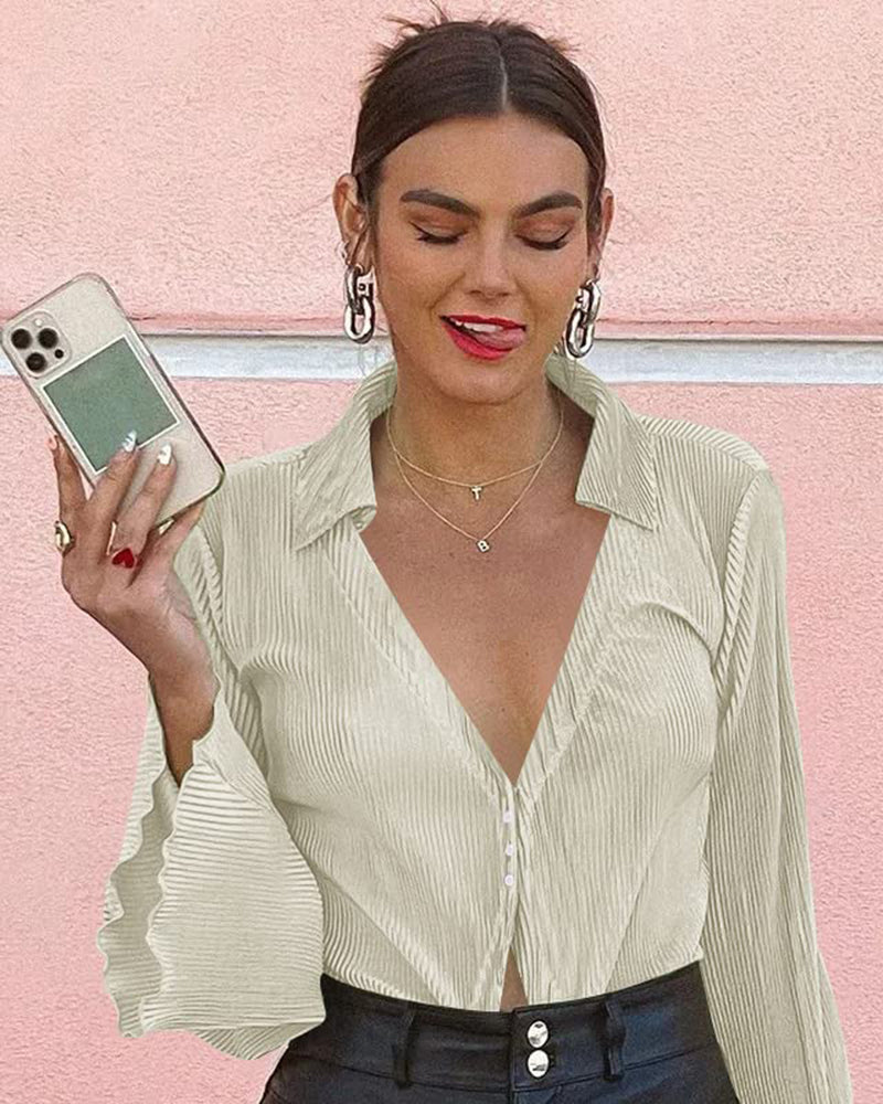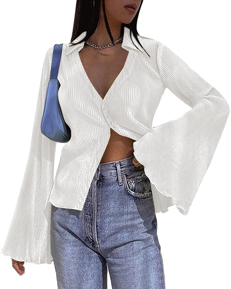 Women's Deep V Neck Shirt Button Front Blouse Bell Long Sleeve Tops - Zeagoo (Us Only)