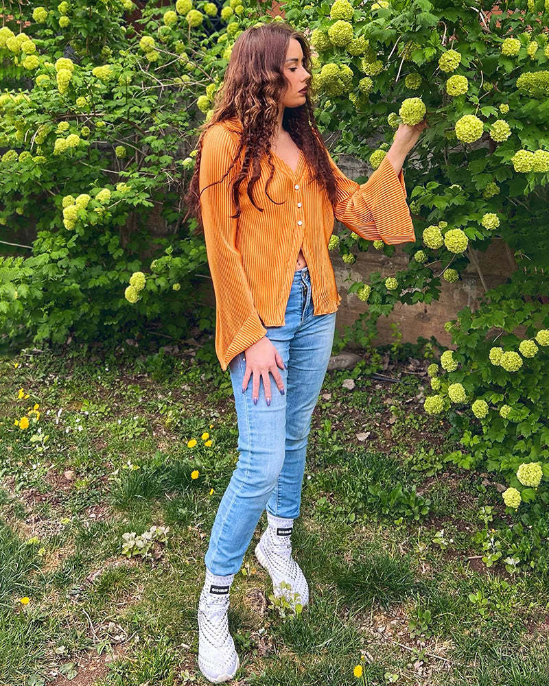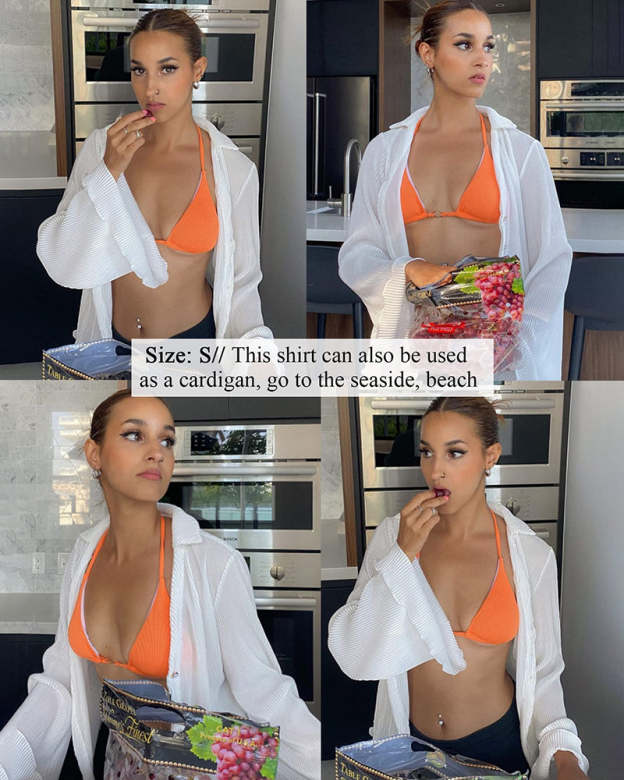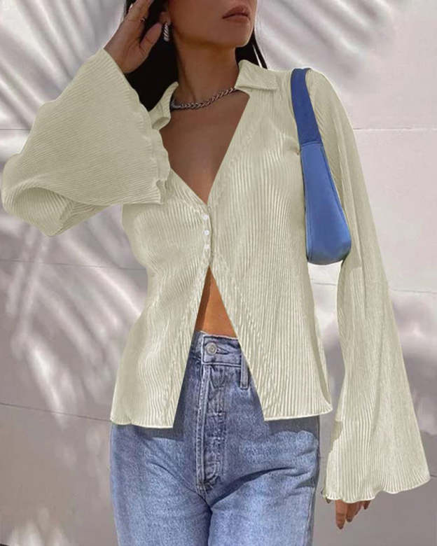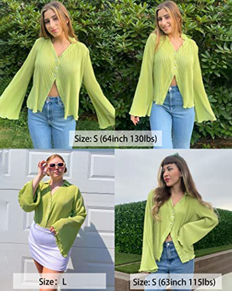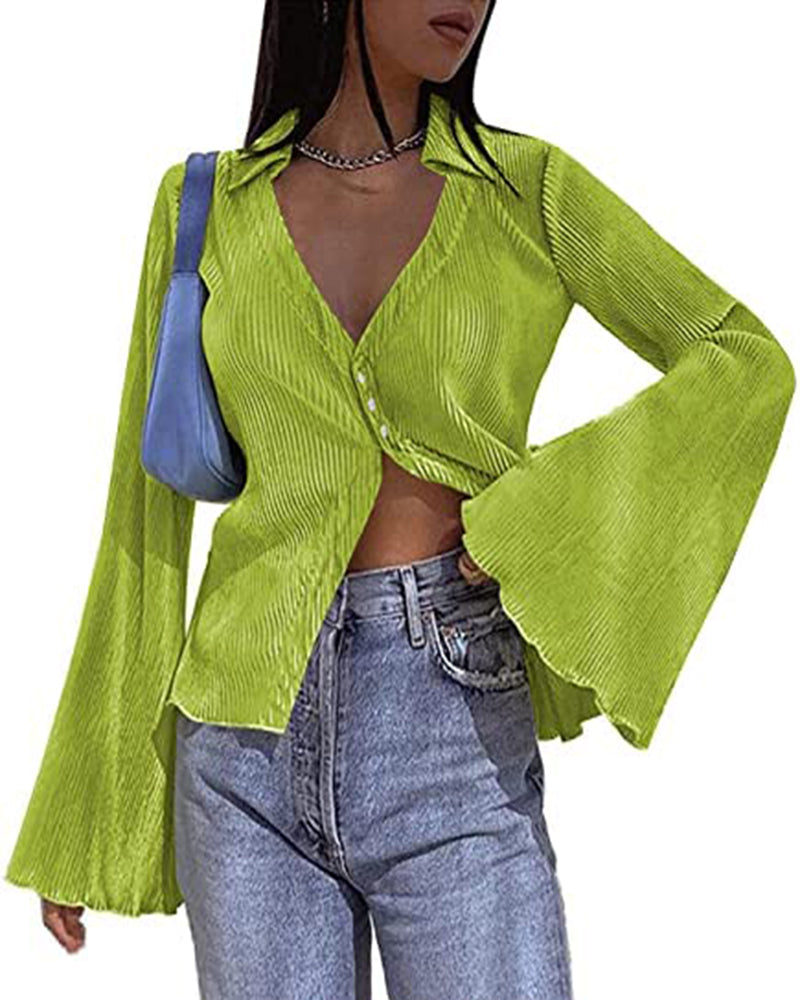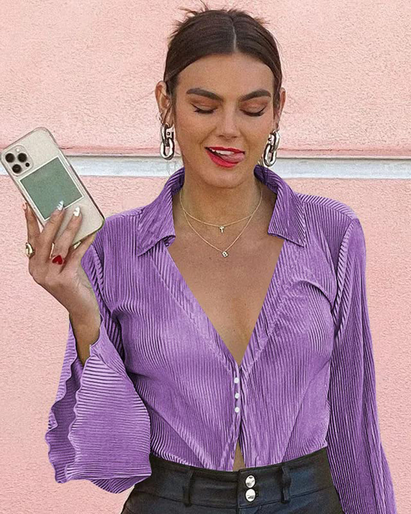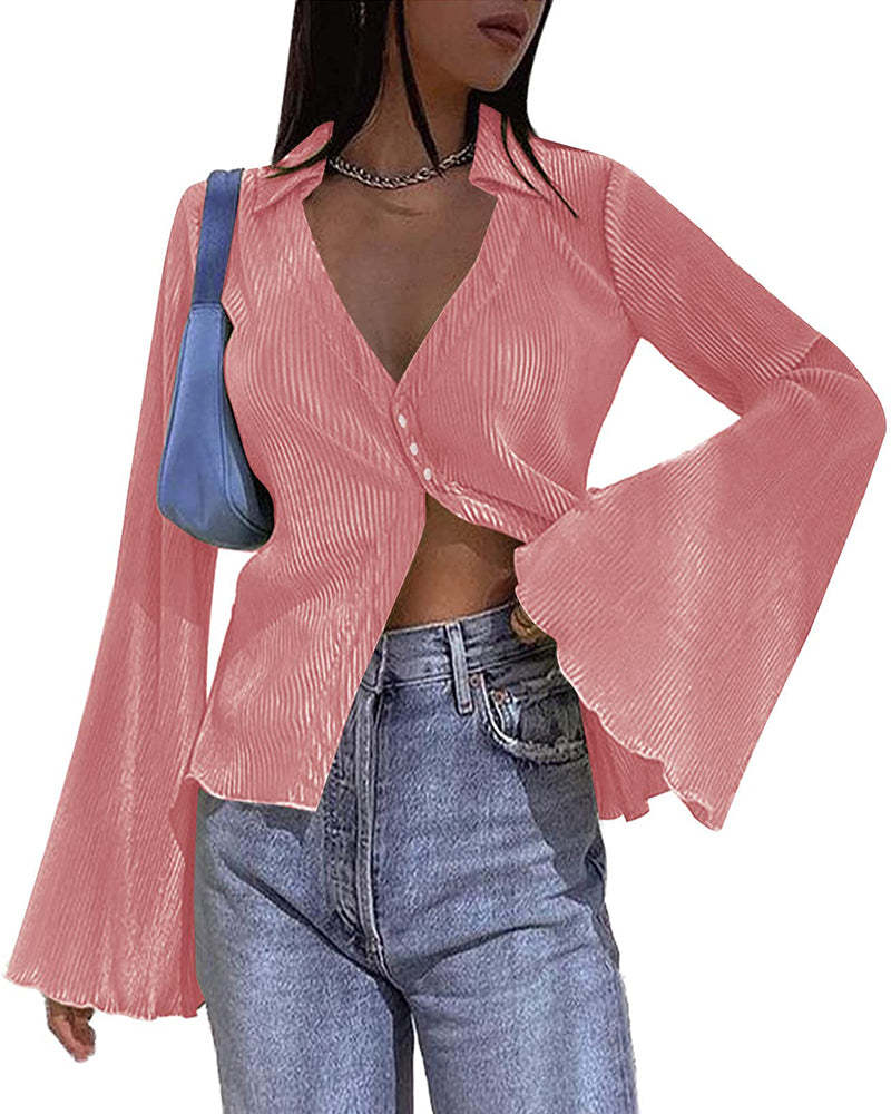 Women's Deep V Neck Shirt Button Front Blouse Bell Long Sleeve Tops - Zeagoo (Us Only)