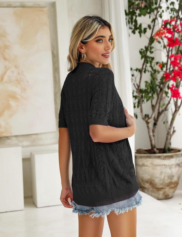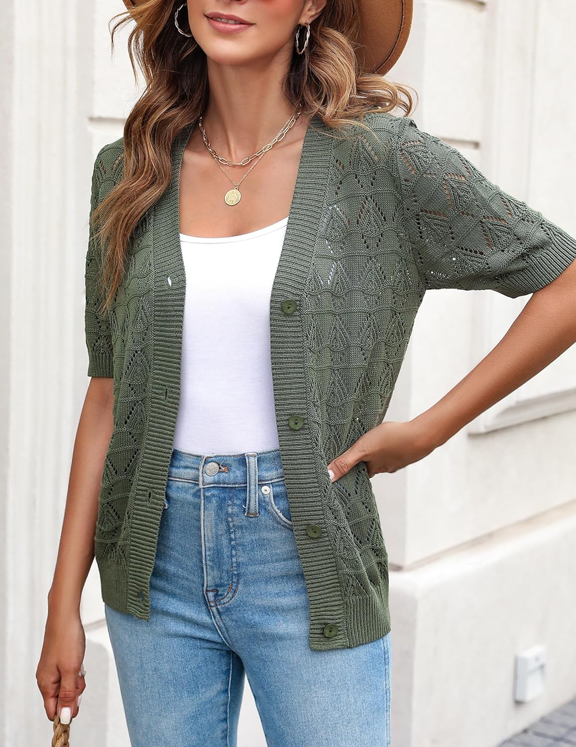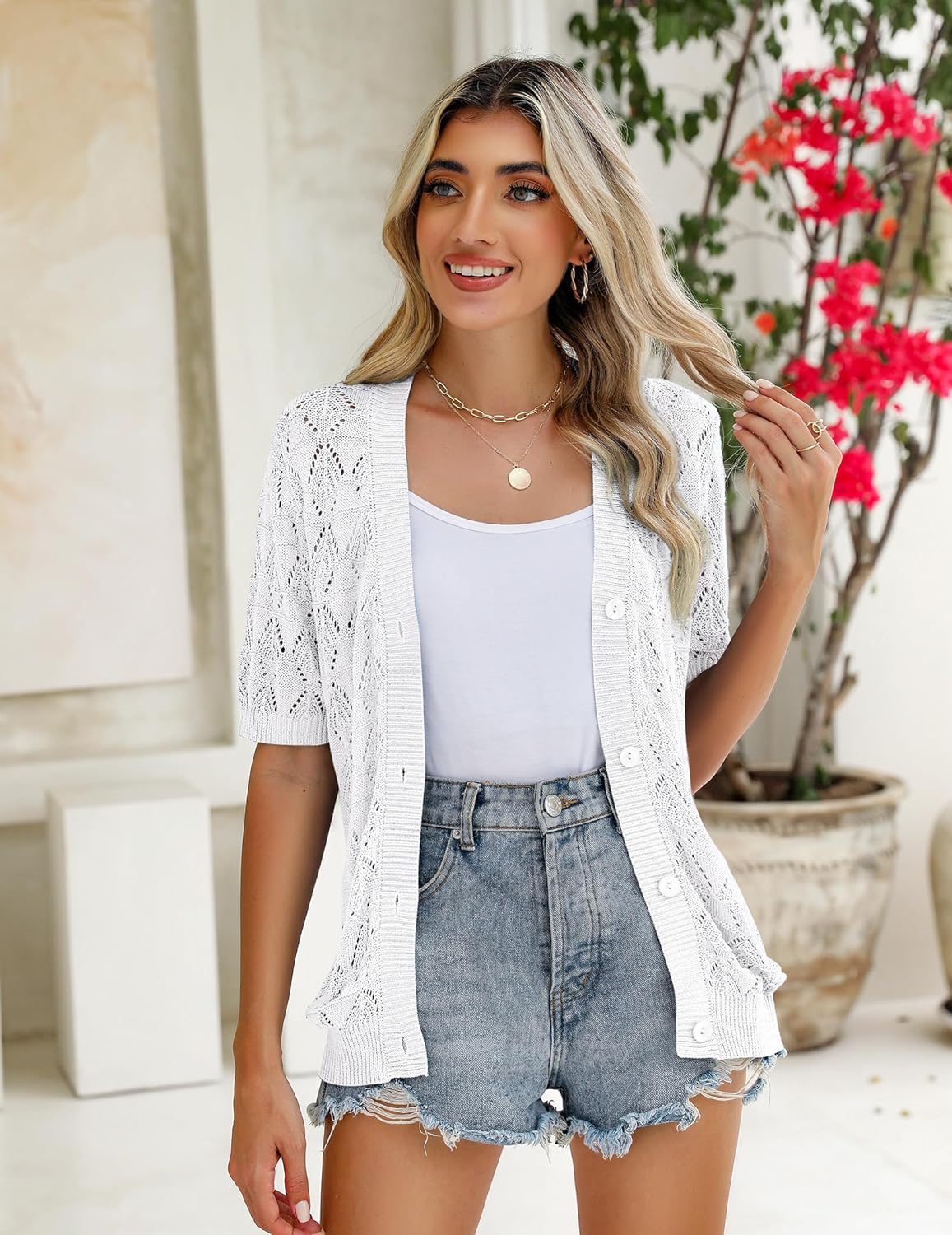 Features: This knitted cardigan shrugs features with crochet patterned, short sleeve, v neck, button-down, hollow out,solid color, ribbed collar cuffs and hem. Shrugs for women dresses, summer cardigan for women, cropped cardigans, bolero sweater for women.